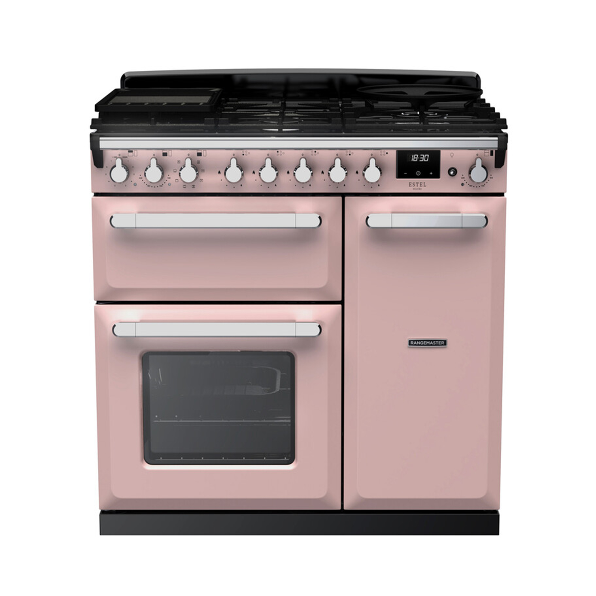 The Rangemaster Estel Deluxe range cooker embodies a classic and timeless aesthetic, blending retro and traditional elements with clean geometric lines and signature chamfered edges. The unique control dials and handles feature a chunky yet ergonomic design that enhances the nostalgic look, perfectly suited to traditional and modern kitchen design in a choice of eight colours, from pastel hues to classic neutral shades.